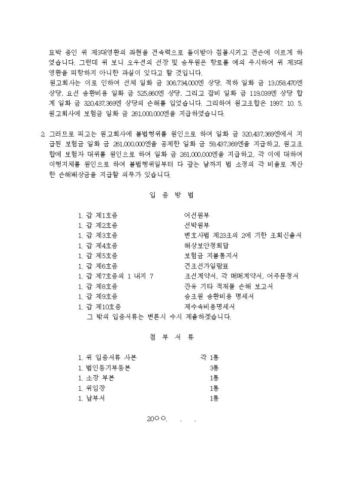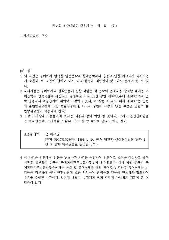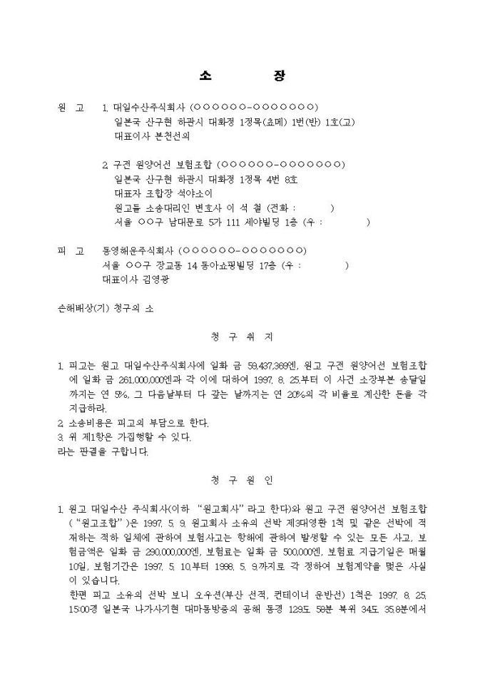 9,000원/월손해배상청구 소장(선박충돌, 보함자대위, 국제사건, 외화, 선체적하보험관할법원, 소송물가액, 번역물)입니다.
