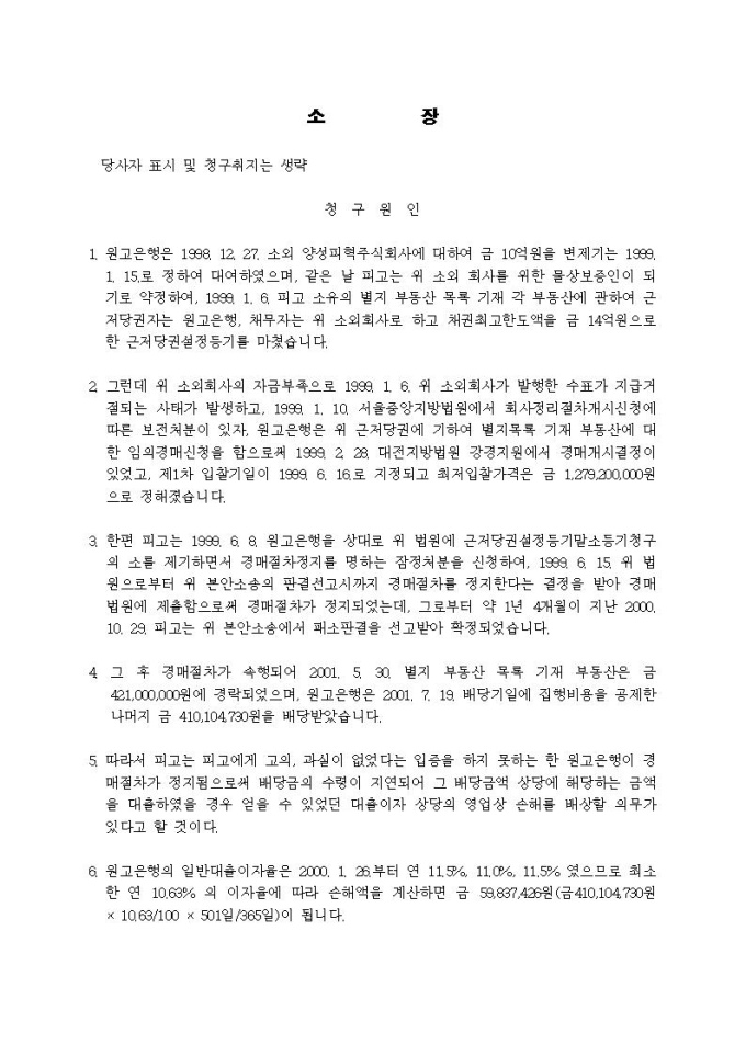 9,000원/월손해배상청구 소장(위법한 경매절차정지신청으로 인한 배당금 수령의 지연)입니다.