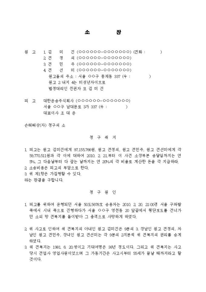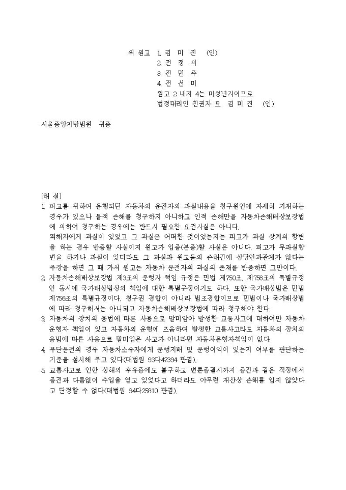 손해배상청구 소장(자배법책임)입니다.
