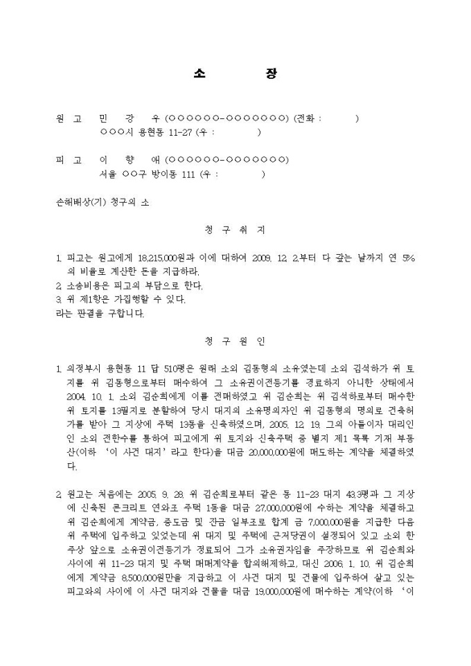 손해배상청구 소장(타인의 권리 매매, 이행불능, 복잡형)입니다.