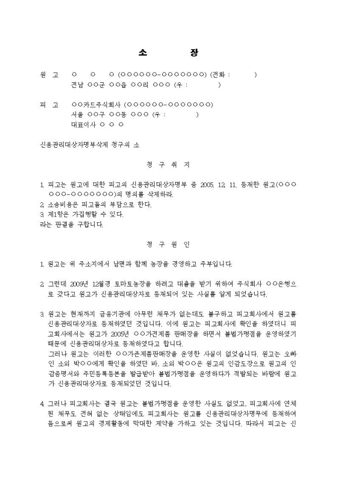 9,000원/월신용관리대상자명부삭제청구 소장입니다.