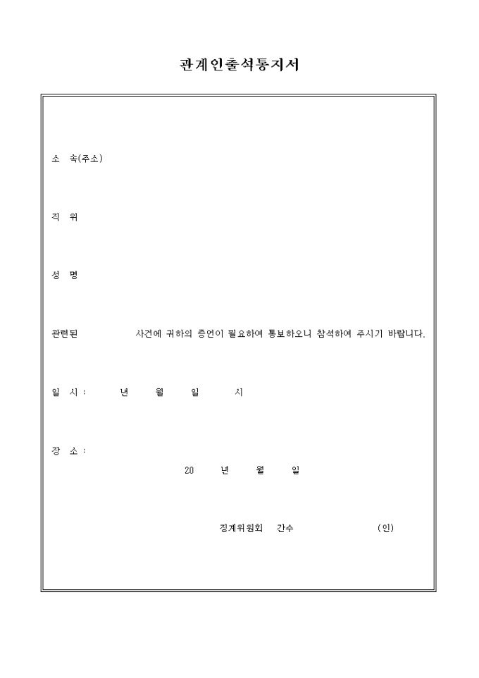 관련사건에 대한 증언이 필요하여 참석을 요청할 때 사용하는 양식입니다.