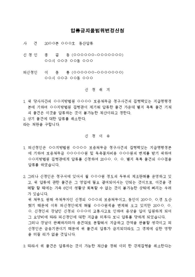 압류금지물범위변경신청서입니다.
