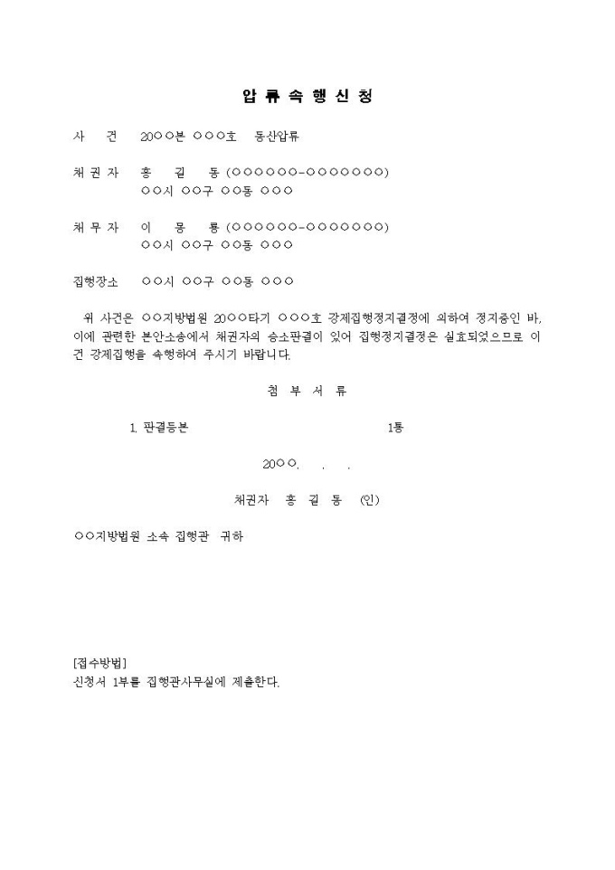 압류속행신청서(집행정지결정실효)