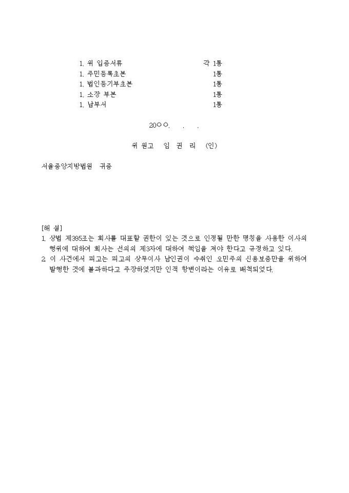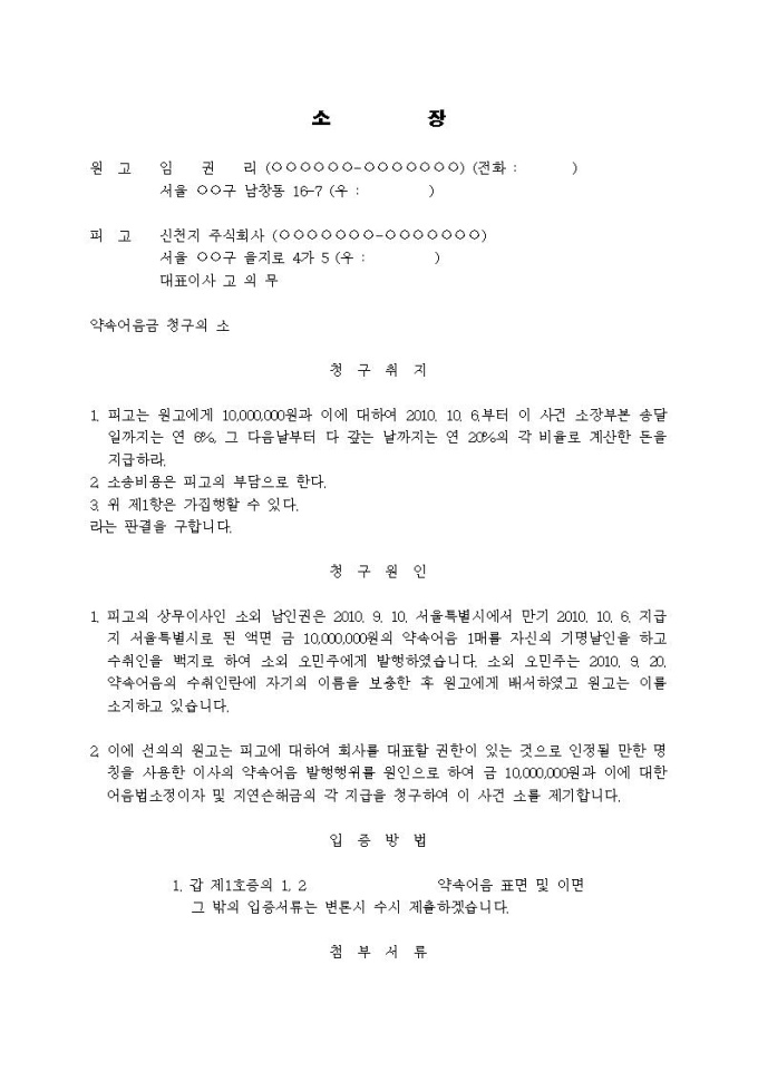 9,000원/월약속어음금청구 소장(발행인에 대한 피배서인의 청구, 표현책임)입니다.
