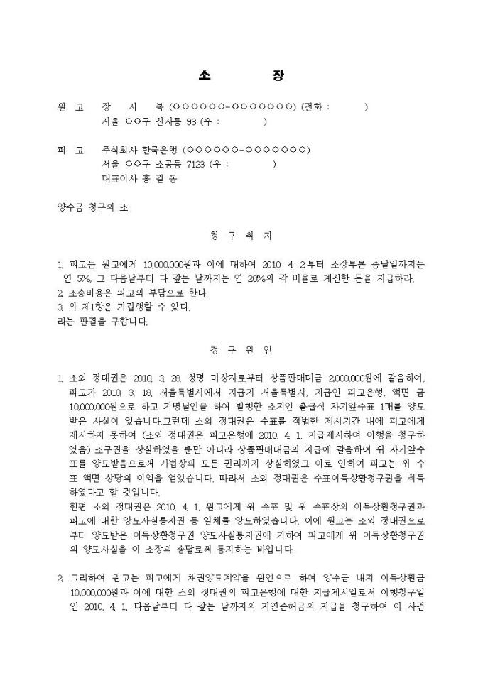 양수금청구 소장(이득상환청구권의 양수)