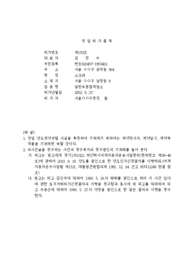 영업허가명의변경청구 소장(영업양도계약, 자동차운송사업면허)