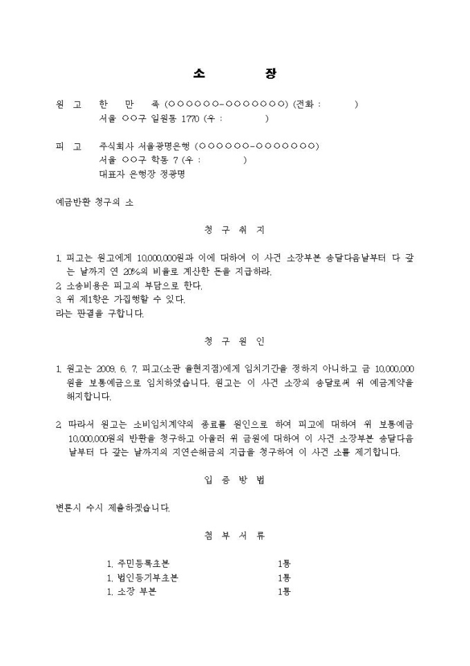 9,000원/월예금반환청구 소장(소비임치계약, 계약종료)입니다.