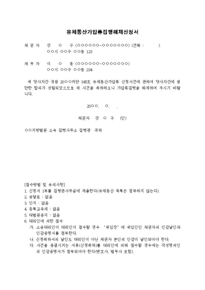 유체동산가압류집행해제신청서(집행 후)입니다.