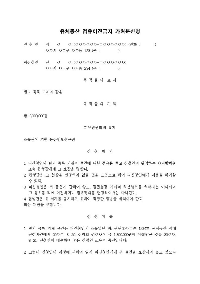 9,000원/월유체동산점유이전금지 가처분신청서(유체동산경매사건에서 낙찰받은 동산)입니다.