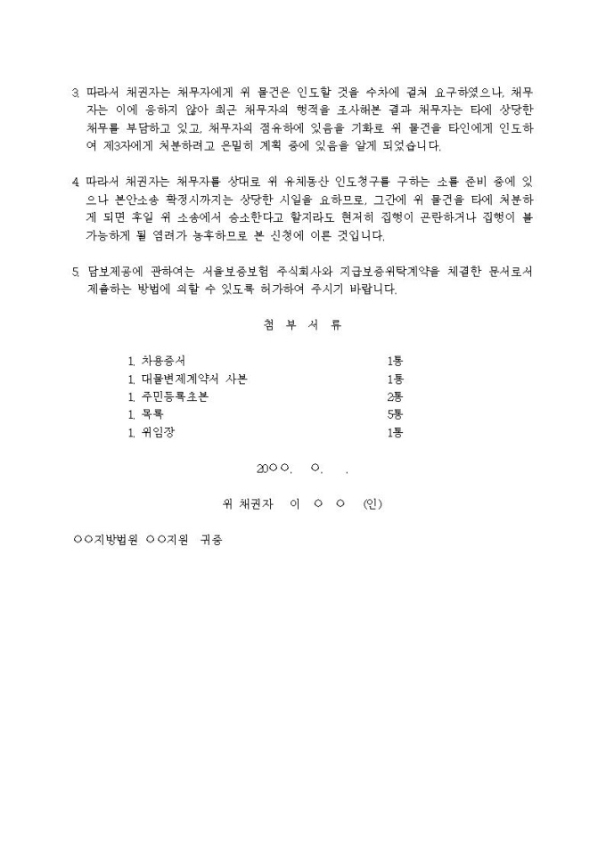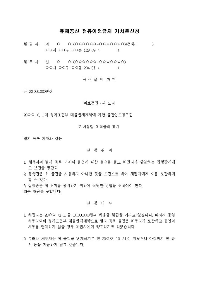 유체동산점유이전금지 가처분신청서(채권자보관형)입니다.
