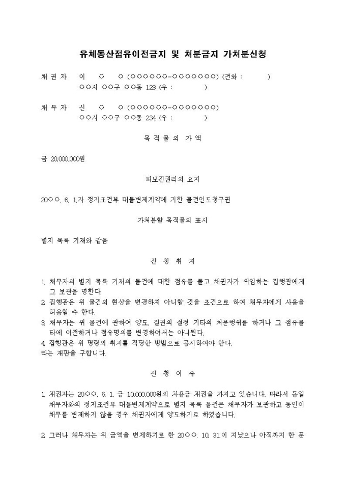 9,000원/월유체동산점유이전금지 및 처분금지가처분신청서(채무자사용형)입니다.