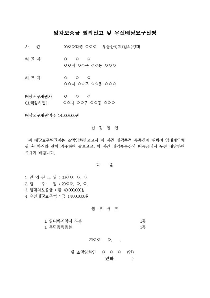 9,000원/월임차보증금 권리신고 및 우선배당요구신청서입니다.