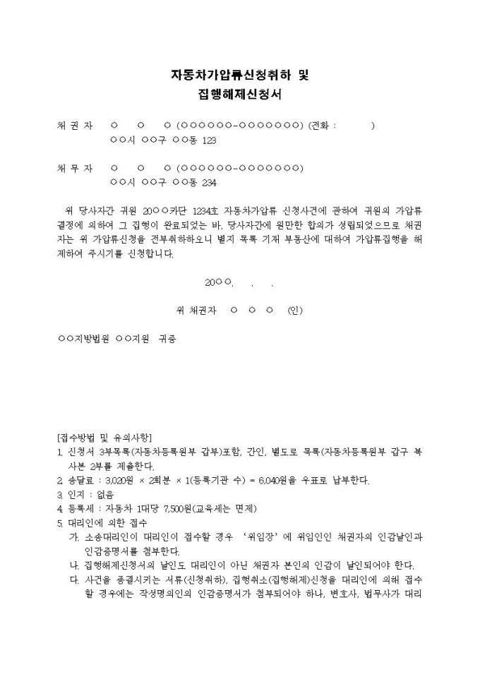 9,000원/월자동차가압류신청취하 및 집행해제신청서(전부취하)입니다.