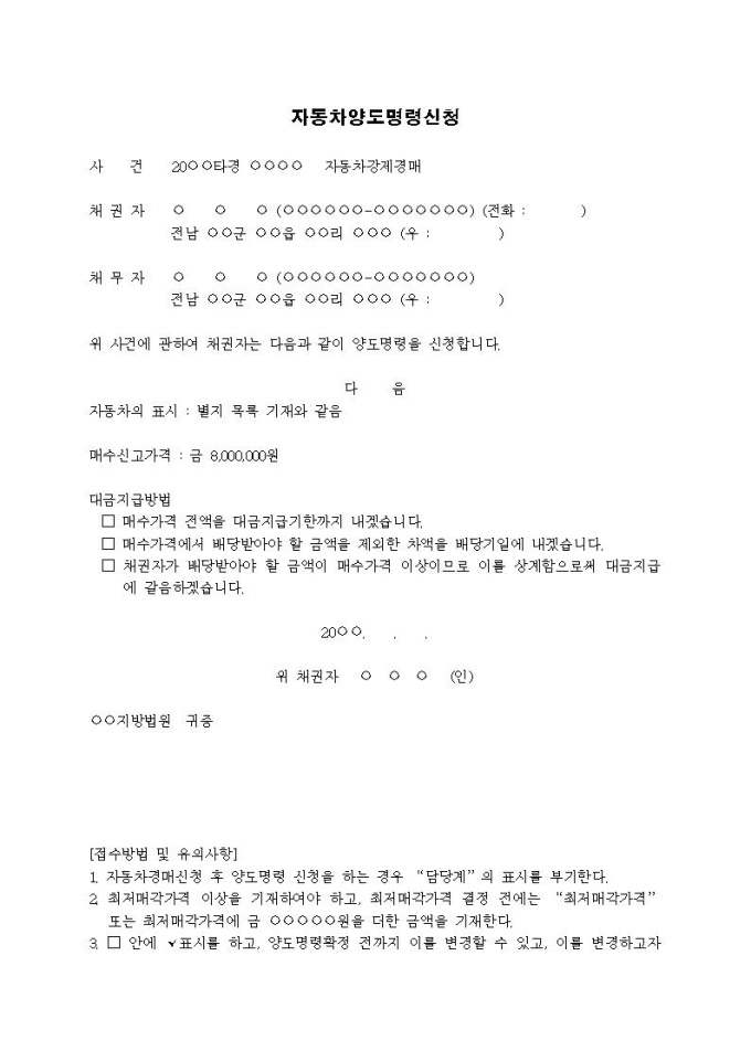 9,000원/월자동차양도명령신청서입니다.