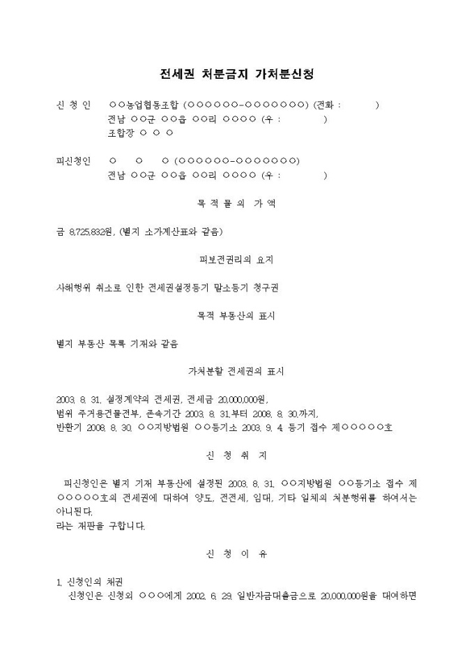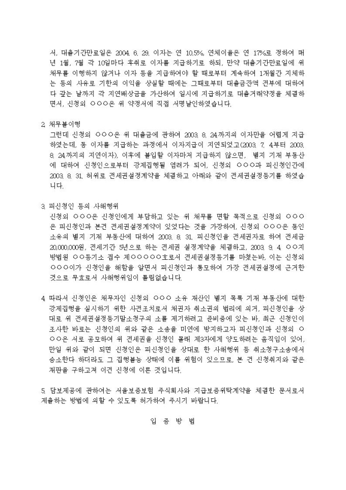 9,000원/월전세권처분금지 가처분신청서(사해행위취소)입니다.