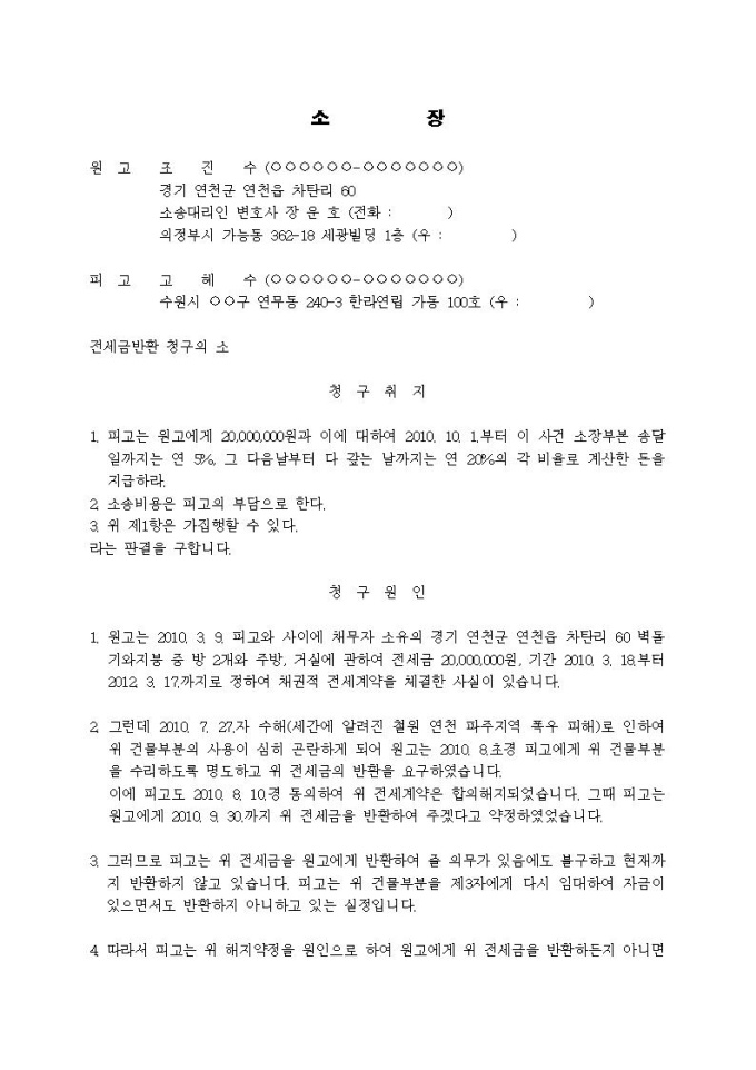 9,000원/월전세금반환청구 소장(합의해지약정, 이행불능)입니다.