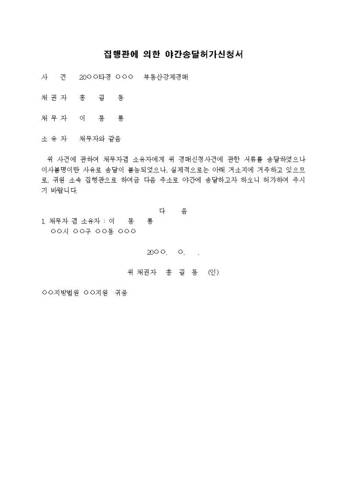 집행관에 의한 야간송달허가신청서(강제경매)입니다.