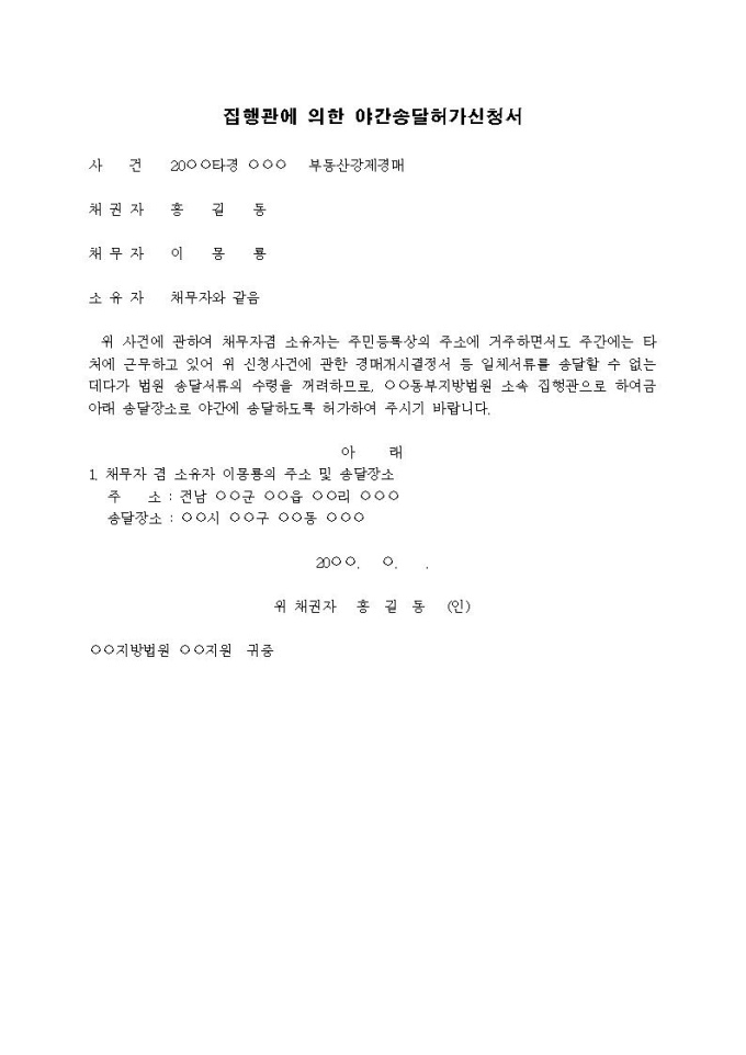 집행관에 의한 야간송달허가신청서(강제경매)(2)입니다.
