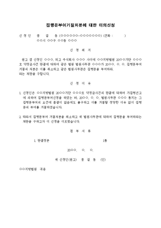 집행문부여거절처분에 대한 이의신청서입니다.
