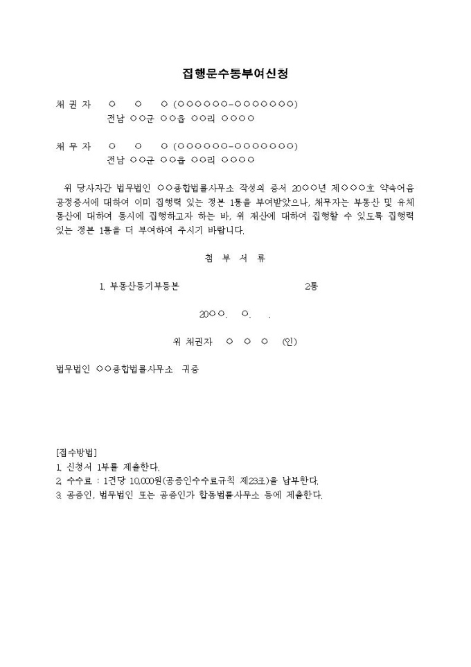 9,000원/월집행문수통부여신청(재산이 산재, 공증인에게 신청)입니다.