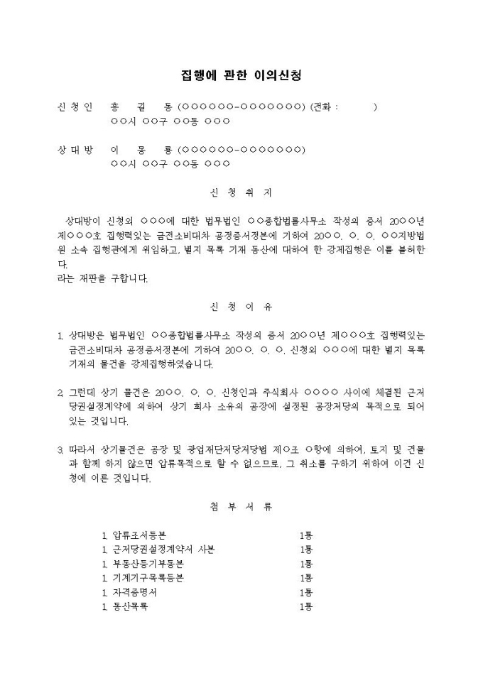 집행에 관한 이의신청서(공장및광업재단저당법)입니다.
