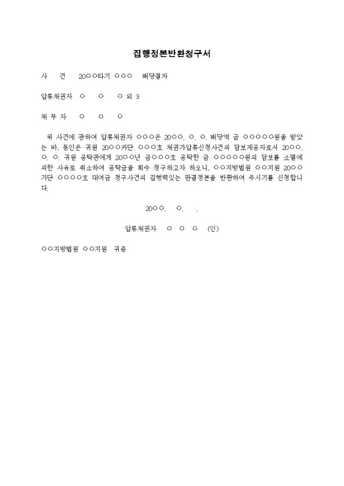 집행정본반환청구서(공탁금회수를 위한)입니다.