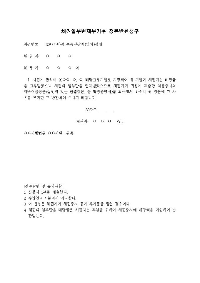 9,000원/월채권일부변제부기 후 정본반환청구서입니다.