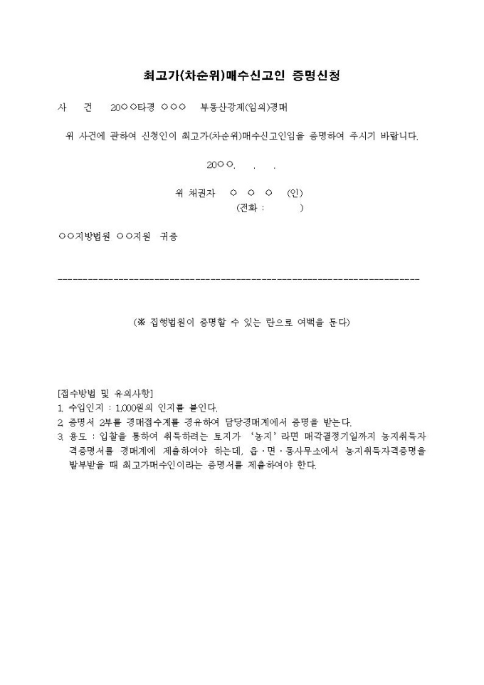 최고가(차순위)매수신고인 증명신청서