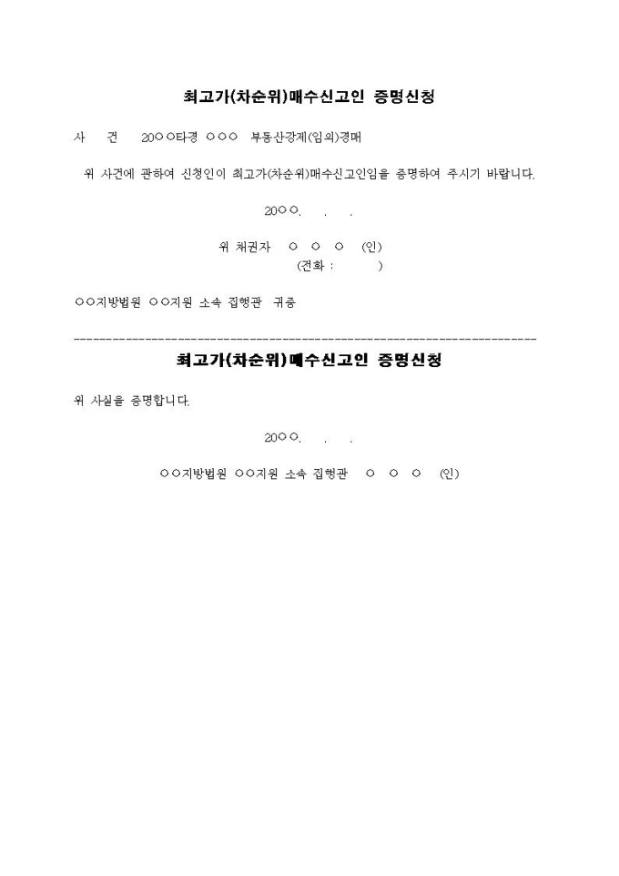 9,000원/월최고가(차순위)매수신고인 증명신청서(2)입니다.