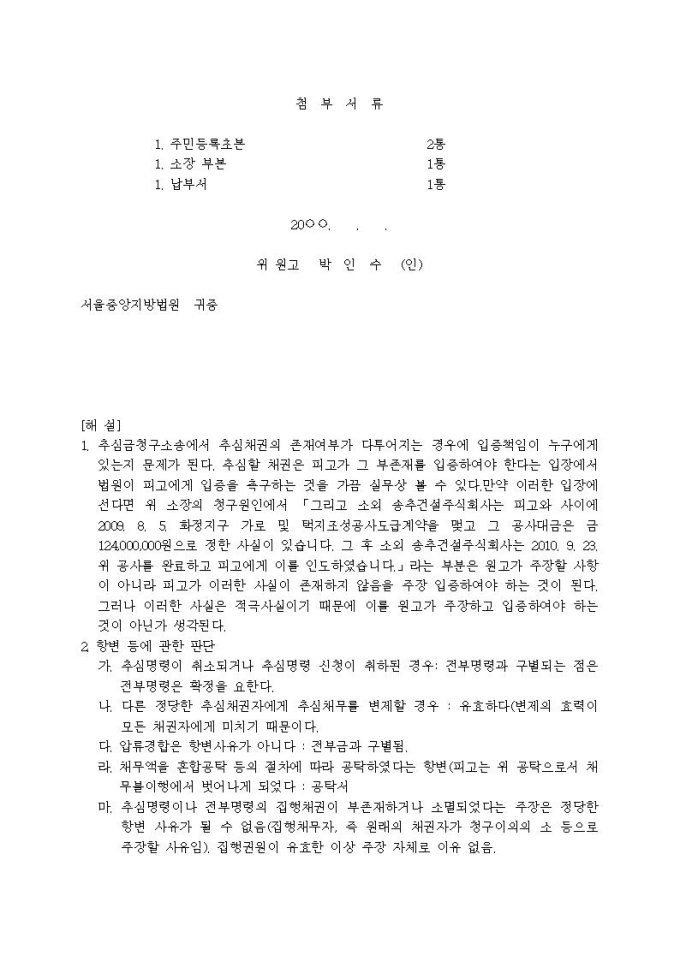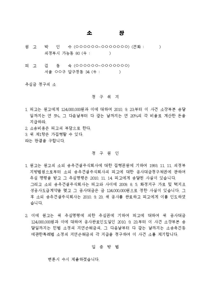 추심금청구 소장(추심명령, 도급계약, 일의 완성인도)