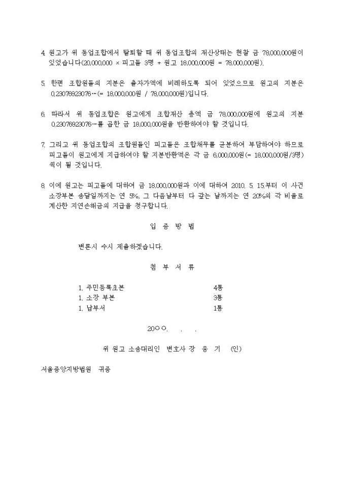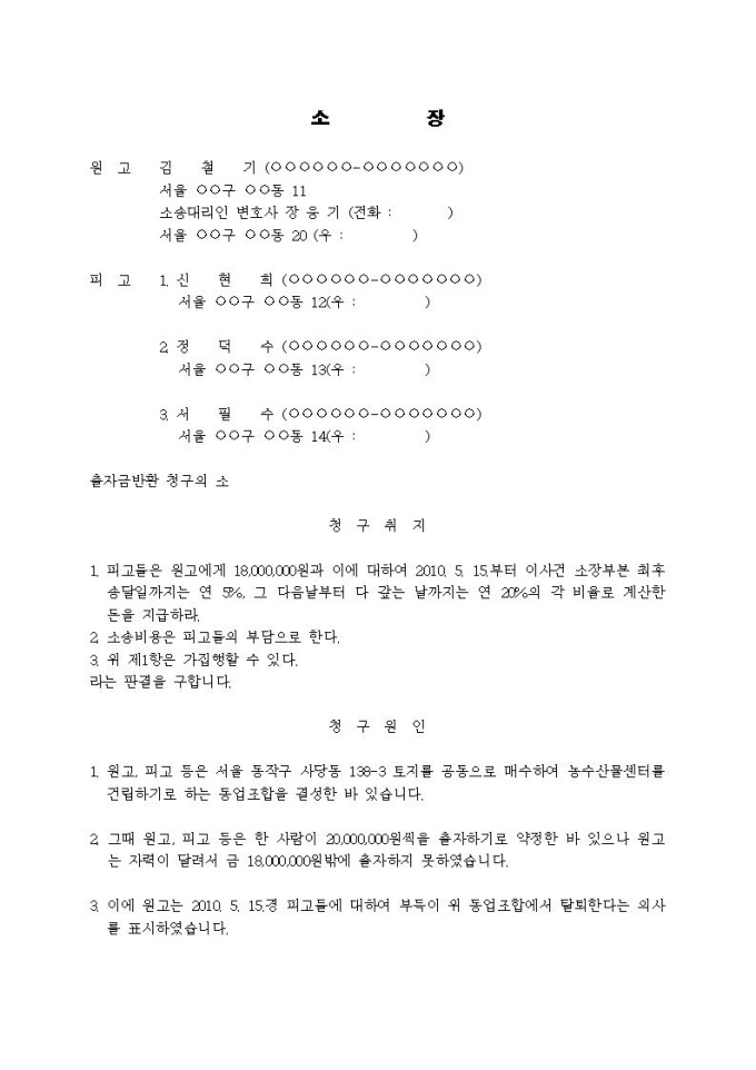 출자금반환청구 소장입니다.