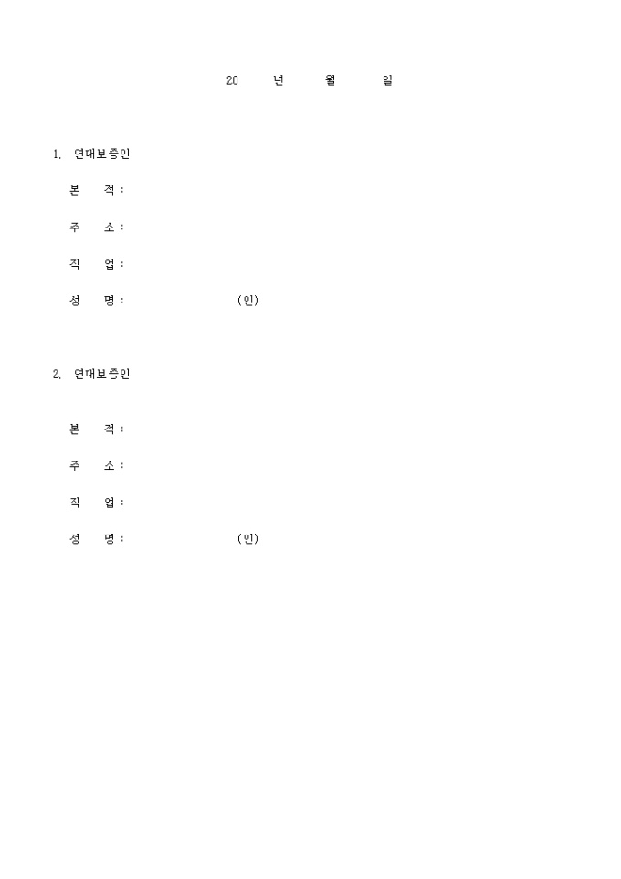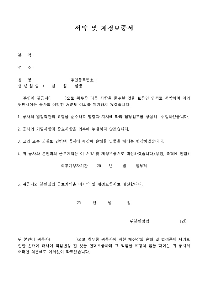 9,000원/월공사로 취무중 기재된 사항을 준수할 것을 보증인 연서로 서약하며 이의 위반시에는 공사의 어떠한 처분도 이의를 제기하지 안음을 약속하는 보증서 양식입니다.