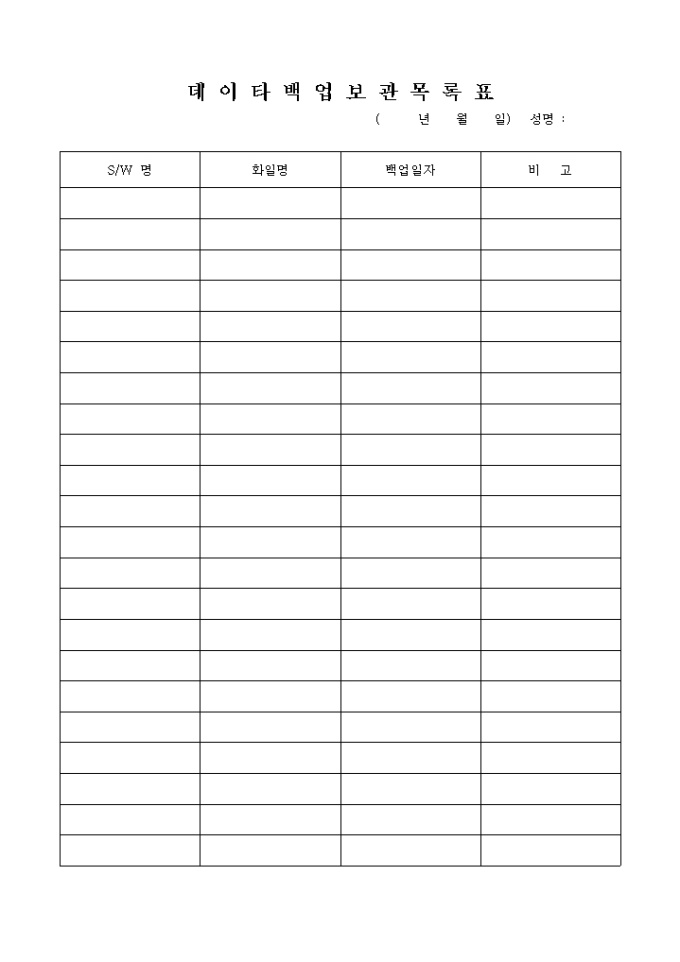 S/W별 화일의 백업기록을 보관하는 데이타백업 보관목록표 양식입니다.