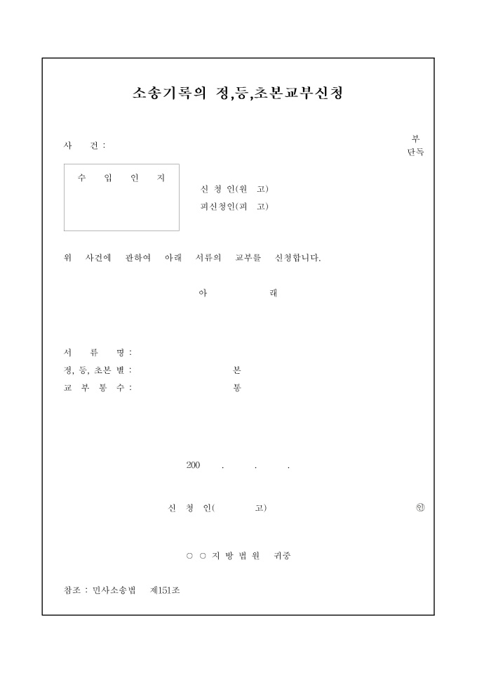 9,000원/월해당 사건에 관해 소송기록의 정, 등, 초본 교부신청을 요청할 때 사용하는 양식입니다.