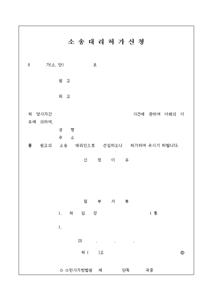 9,000원/월당사자간 사건에 관해 특정사유로 명시된 사람을 원고의 소송 대리인으로 선임을 허가요청할 때 사용하는 양식입니다.
