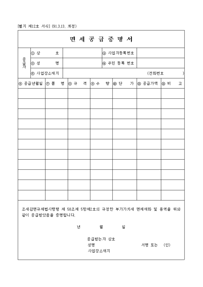 조세감면규제법시행령 제 58조제 5항제2호의 규정한 부가가치세 면제재화 및 용역을 위와같이 공급받았음을 증명하실때 사용하시는 양식입니다.