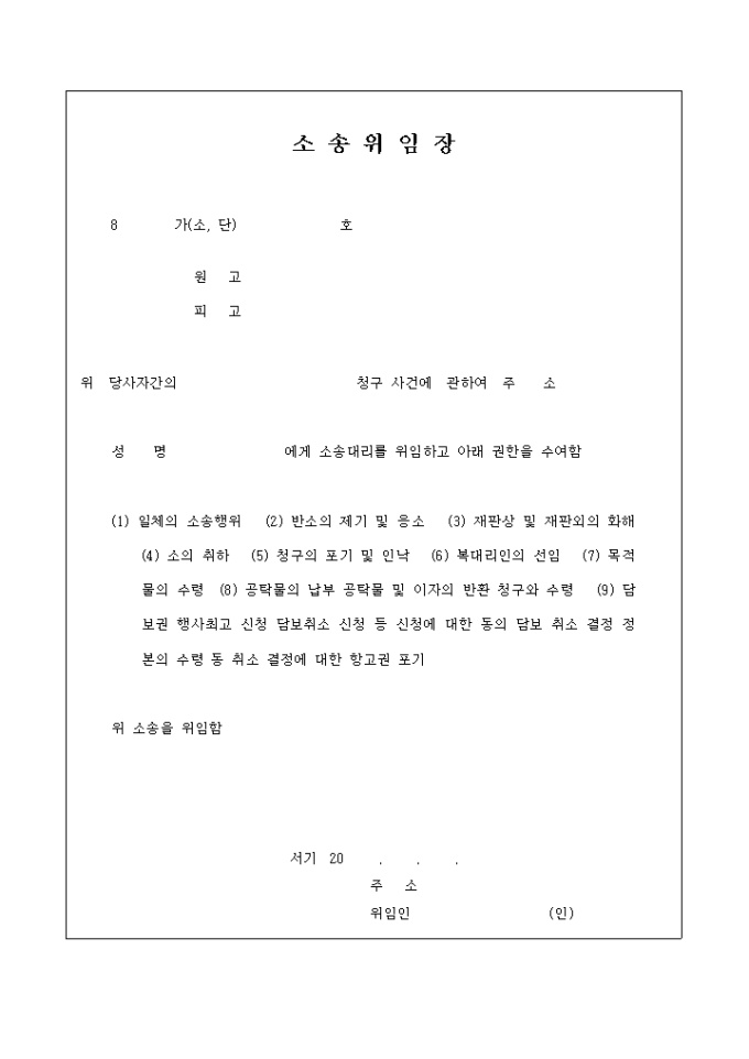 당사자간의 청구사건에 관해 명시된 사람에게 소송대리을 위임하고 기재한 권한을 수여할 때 사용하는 양식입니다. (일체의 소송행위, 반소의 제기 및 응소, 재판산 밍 재판외의 화해등)