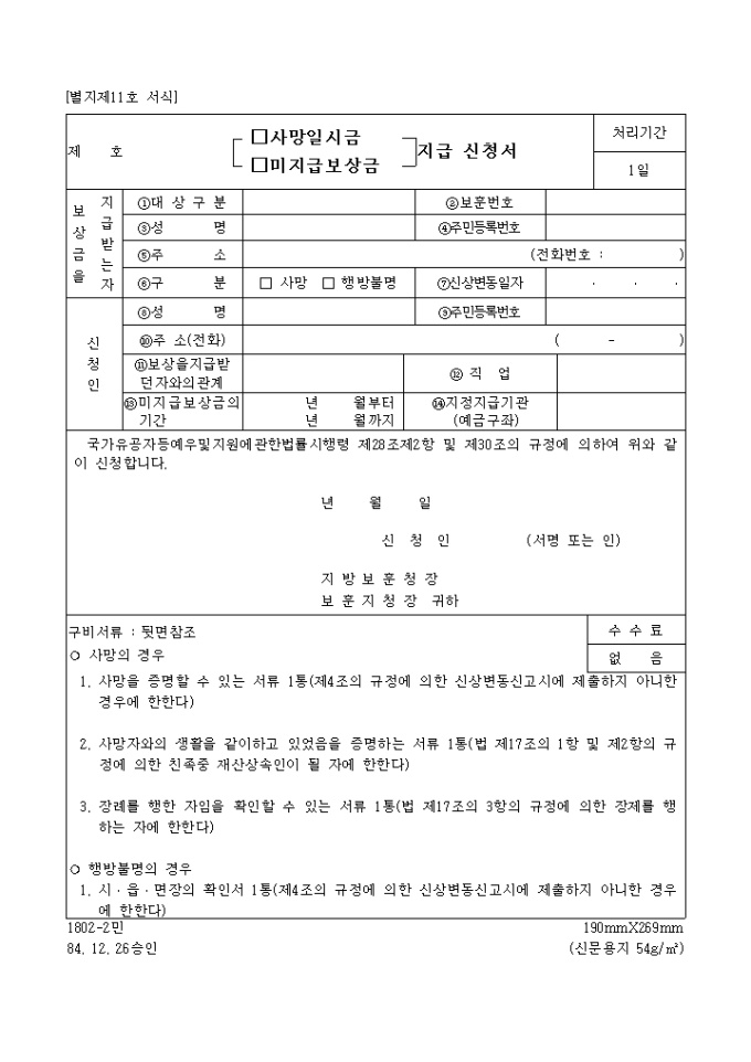 국가유공자등 예우 및 지원에 관한 법률시행령 제28조제2항 및 제30조의 규정에 의하여 신청고자 할 때 쓰이는 양식지입니다.