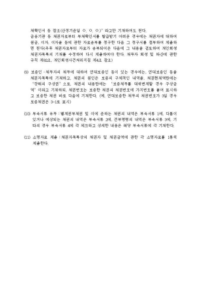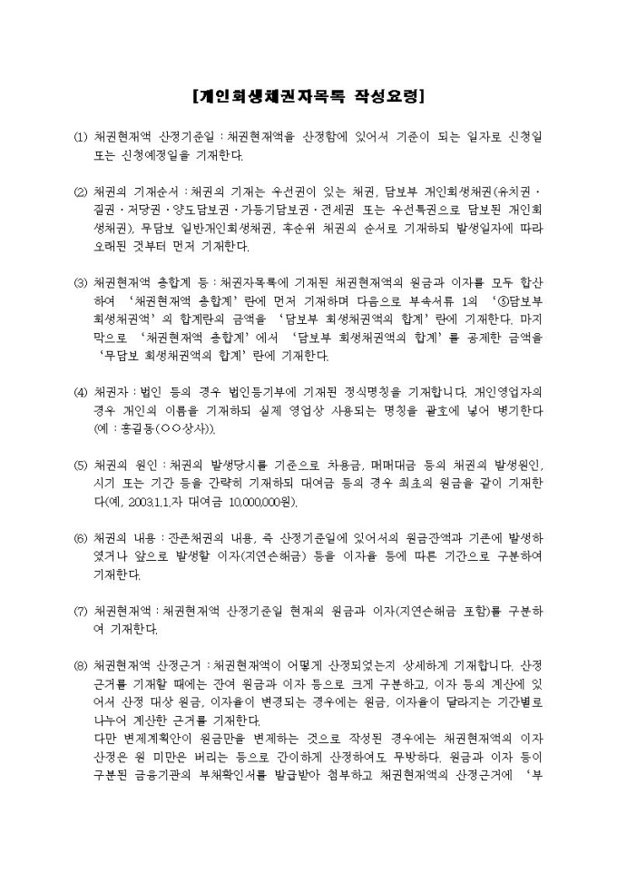 개인회생채권자목록 작성요령