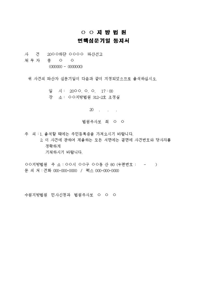 심문기일 통지서(채무자용)입니다.