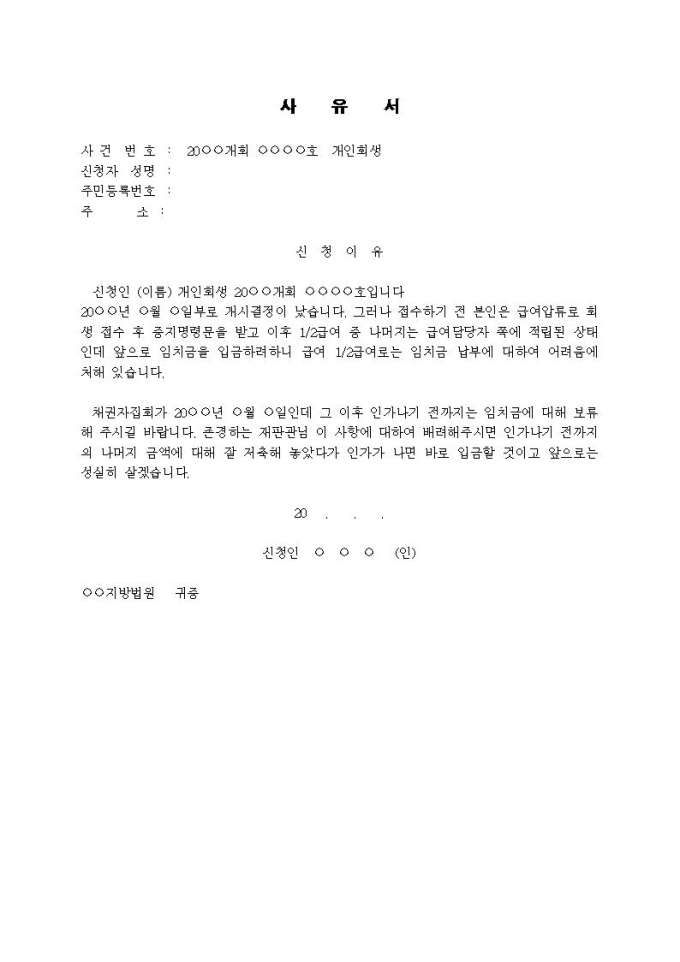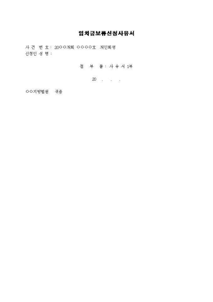 9,000원/월임치금 보류신청 사유서입니다.