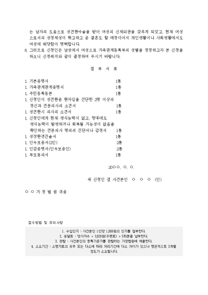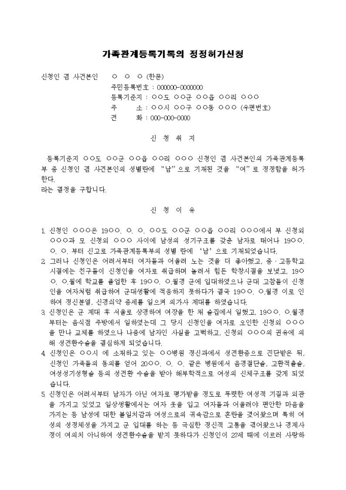 9,000원/월가족관계등록기록의 정정허가신청서(성전환자)입니다.