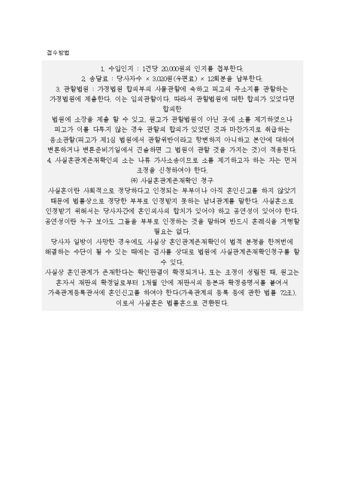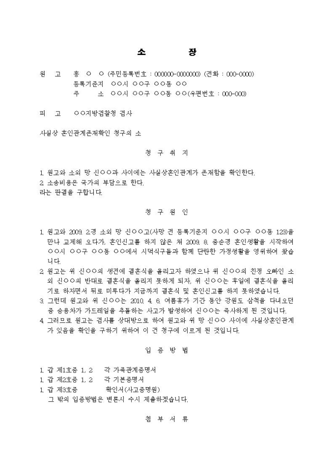 사실상 혼인관계존재 확인청구의 소장(결혼식을 미루다가 사망)입니다.