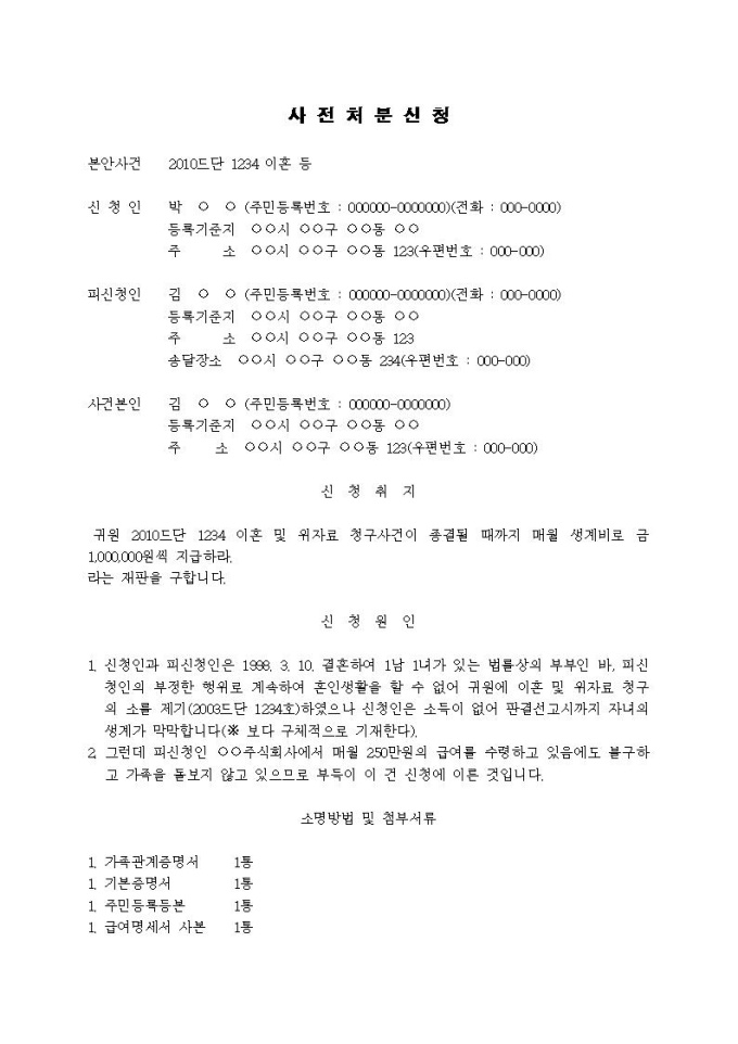 9,000원/월사전처분신청서(이혼 등으로 인한 사정의 생계비지급처분신청)입니다.