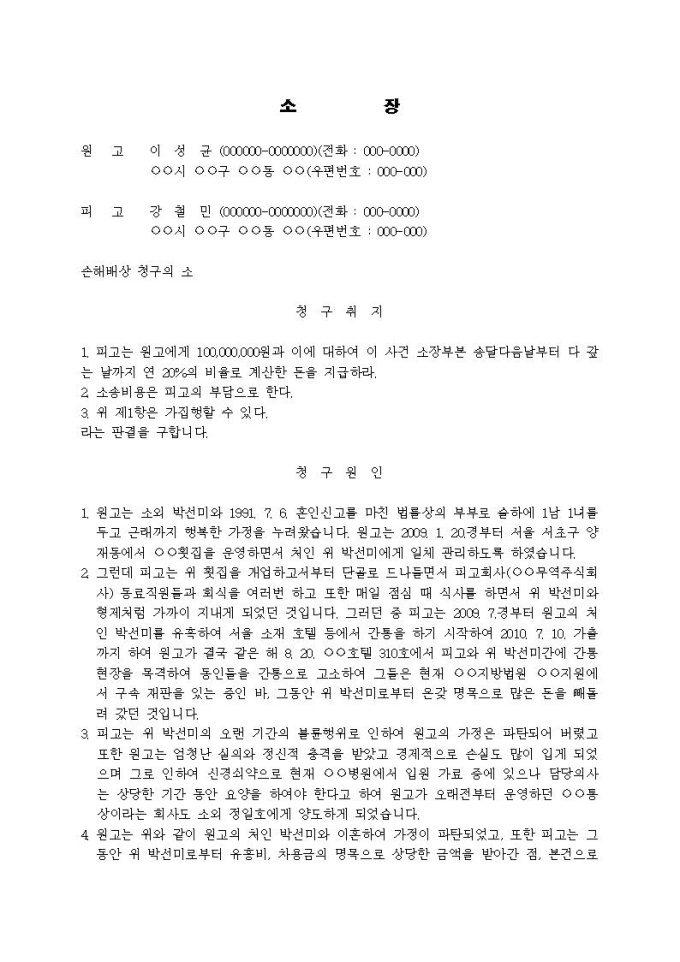 9,000원/월손해배상 청구의 소장(간통피해)입니다.