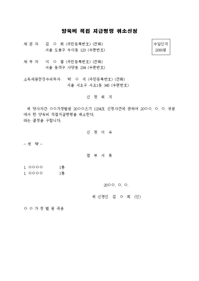 양육비 직접지급명령 취소신청서입니다.