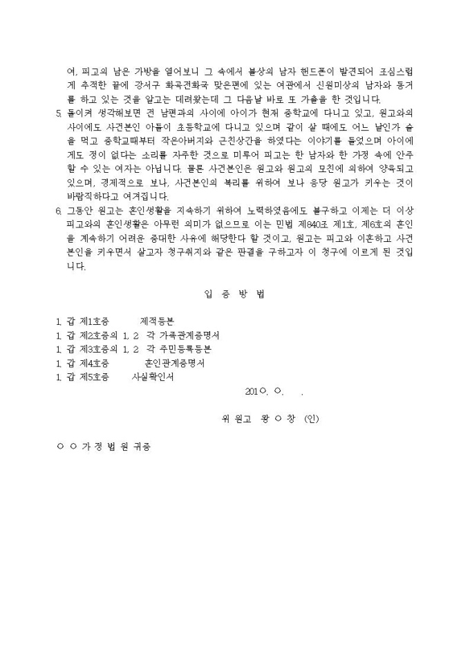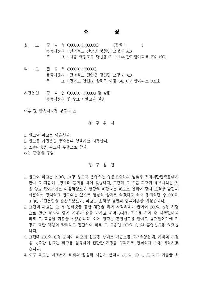 9,000원/월이혼, 양육자 지정 청구의 소장입니다.