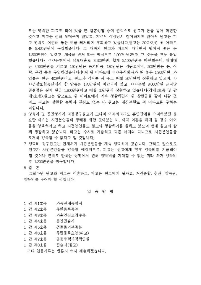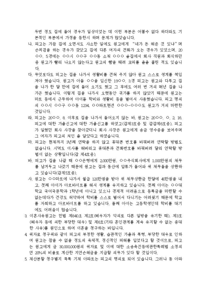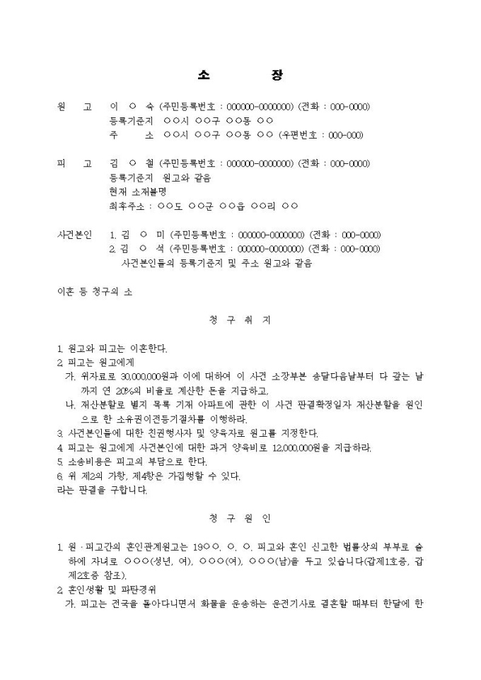 이혼, 친권행사자ㆍ양육자 지정, 위자료, 양육비, 재산분할 청구의 소장