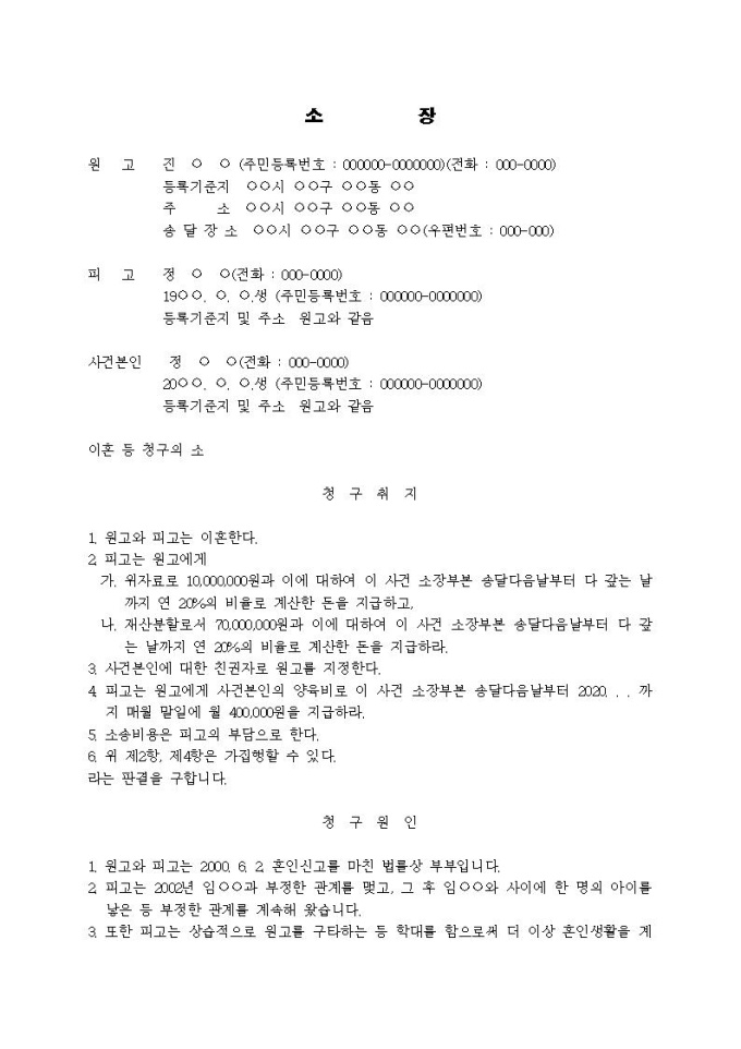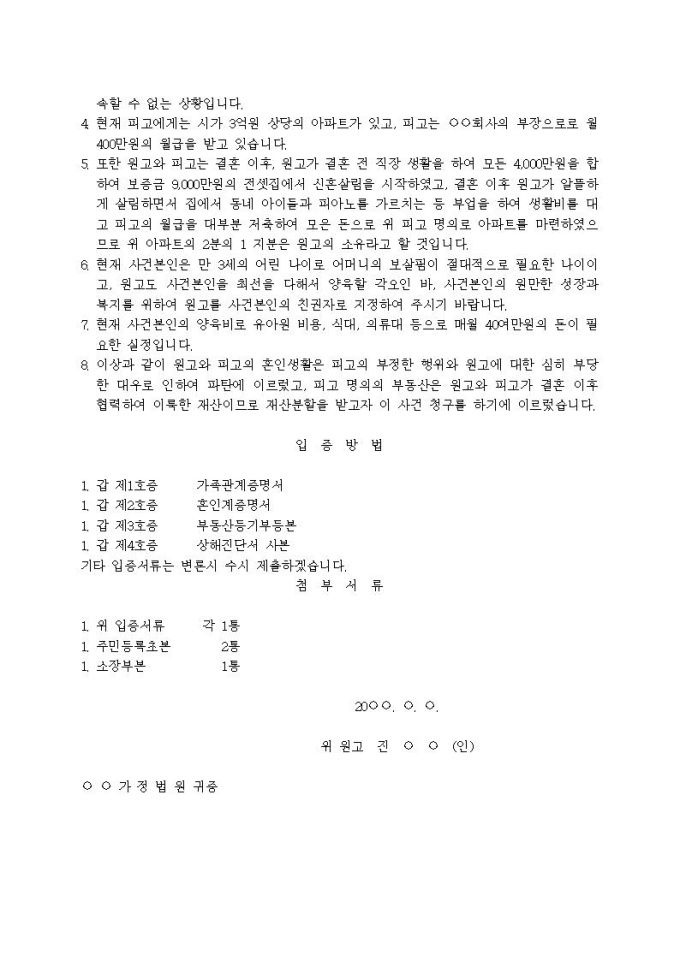 9,000원/월이혼, 친권행사자ㆍ양육자지정, 위자료, 재산분할 청구의 소장(2)입니다.